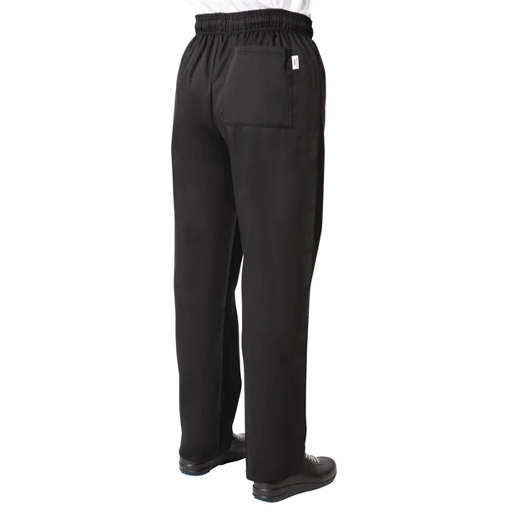 These black chef pants from Nisbets Essentials offer great value when providing quick & easy replacements for kitchen staff. Featuring an elasticated drawstring waist with a lightweight design, they will keep you cool & comfortable all day. Available in a choice of sizes, with a single back pocket for added convenience.